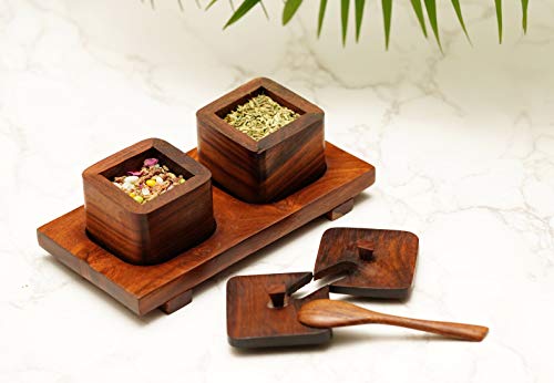 Freakway Sheesham Wood Serving Jar Set with Tray and Spoon for Home Kitchen and Restaurants Decor, 50 ml, Brown -2-Pieces