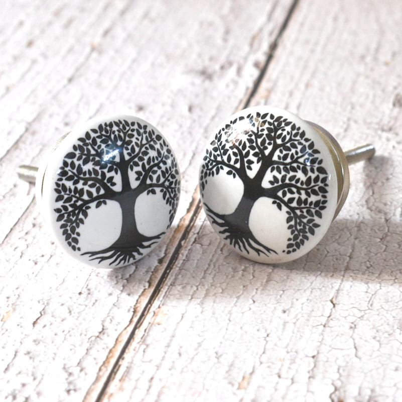 Hand Painted Ceramic Cabinet Drawer Pull/Use for Cupboard, Wardrobe Door/Kitchen Cabinet Pull- White Knobs, Black Knobs- Set of 10 (Tree of Life)